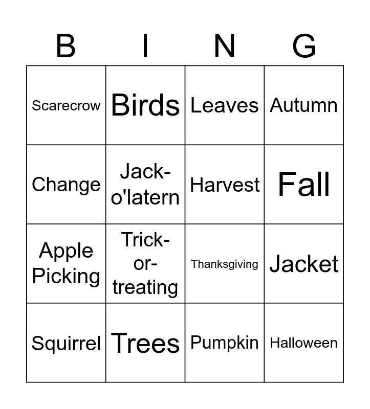 This bingo card has 16 words: Trees, Jacket, Leaves, Scarecrow, Apple Picking, Birds, Thanksgiving, Pumpkin, Change, Jack-o'latern, Squirrel, Autumn, Trick-or-treating, Fall, Harvest and Halloween.