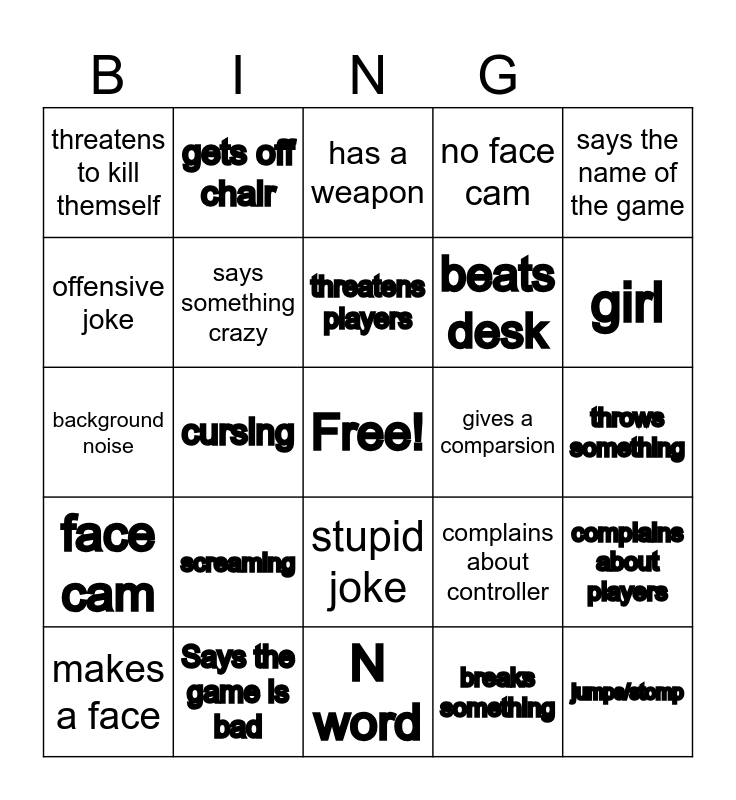 This bingo card has a free space and 24 words: screaming, Says the game is bad, threatens players, makes a face, says the name of the game, threatens to kill themself, offensive joke, gets off chair, gives a comparsion, stupid joke, beats desk, background noise, complains about controller, complains about players, says something crazy, breaks something, throws something, has a weapon, girl, cursing, jumps/stomp, face cam, no face cam and N word.