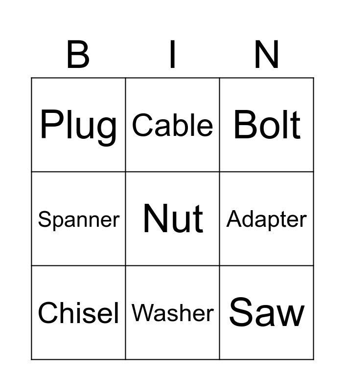 This bingo card has a free space and 8 words: Adapter, Bolt, Cable, Chisel, Plug, Saw, Spanner and Washer.