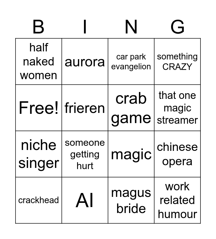 This bingo card has 16 words: AI, chinese opera, car park evangelion, half naked women, niche singer, aurora, magic, magus bride, Free!, frieren, crackhead, something CRAZY, someone getting hurt, that one magic streamer, crab game and work related humour.