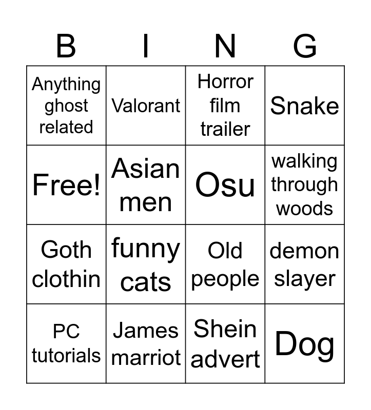 This bingo card has 16 words: James marriot, demon slayer, Horror film trailer, Anything ghost related, Goth clothin, Valorant, Old people, Shein advert, Free!, Asian men, PC tutorials, Snake, funny cats, walking through woods, Osu and Dog.