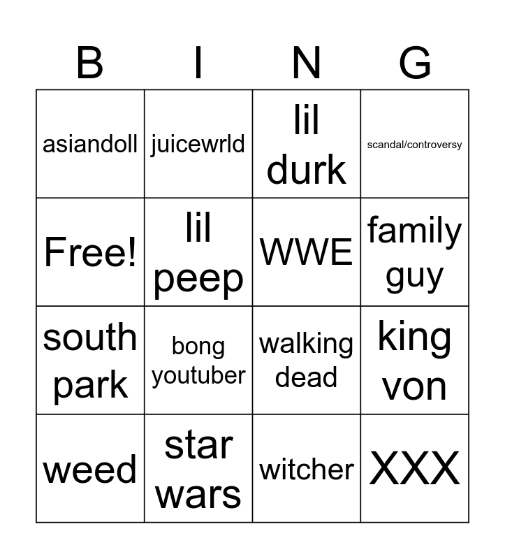 This bingo card has 16 words: star wars, king von, lil durk, asiandoll, south park, juicewrld, walking dead, witcher, Free!, lil peep, weed, scandal/controversy, bong youtuber, family guy, WWE and XXX.