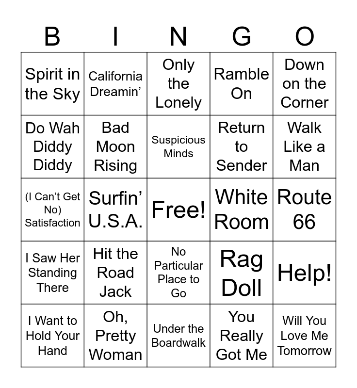 This bingo card has a free space and 40 words: Fortunate Son, (I Can’t Get No) Satisfaction, Twist and Shout, Bad Moon Rising, Oh, Pretty Woman, No Particular Place to Go, Suspicious Minds, Runaway, Down on the Corner, I Saw Her Standing There, Surfin’ U.S.A., Ramble On, Will You Love Me Tomorrow, Route 66, White Room, Hit the Road Jack, Proud Mary, Spirit in the Sky, Good Vibrations, Only the Lonely, Help!, You Really Got Me, Return to Sender, Do Wah Diddy Diddy, The Locomotion, Come See About Me, Baby Love, (Marie’s the Name) His Latest Flame, You Showed Me, Denise, Louie Louie, I Want to Hold Your Hand, Runaround Sue, Rag Doll, Walk Like a Man, Under the Boardwalk, Please Mr. Postman, Calendar Girl, California Dreamin’ and Mrs. Brown, You’ve Got a Lovely Daughter.