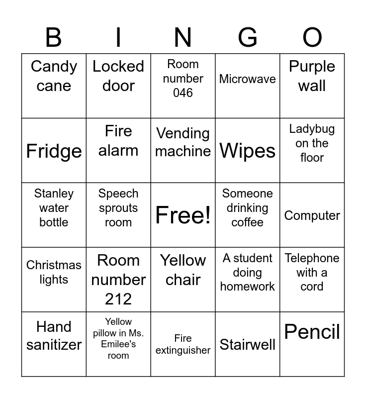 This bingo card has a free space and 24 words: Room number 212, Yellow pillow in Ms. Emilee's room, Vending machine, Hand sanitizer, Purple wall, Candy cane, Fridge, Locked door, Someone drinking coffee, Yellow chair, Wipes, Stanley water bottle, A student doing homework, Telephone with a cord, Fire alarm, Stairwell, Computer, Room number 046, Ladybug on the floor, Speech sprouts room, Pencil, Christmas lights, Microwave and Fire extinguisher.