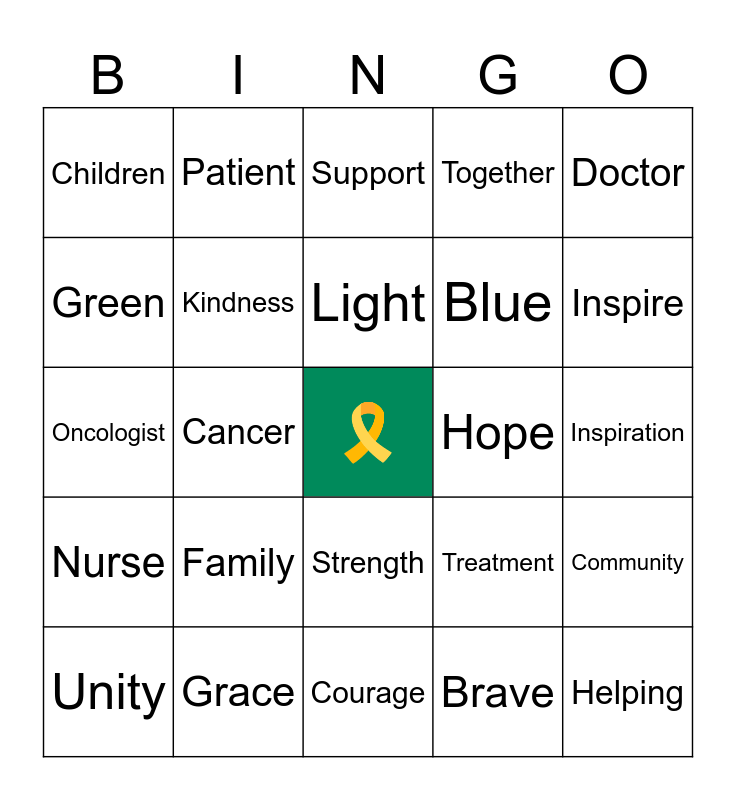 This bingo card has a free space and 30 words: Grace, Pediatric, Cancer, Fight, Children, Support, Kindness, Strength, Hope, Courage, Inspiration, Helping, Brave, Patience, Inspire, Chemo, Treatment, Nurse, Family, Doctor, Oncologist, Philanthropy, Patient, Blue, Green, Together, Community, Unity, Light and Champion.