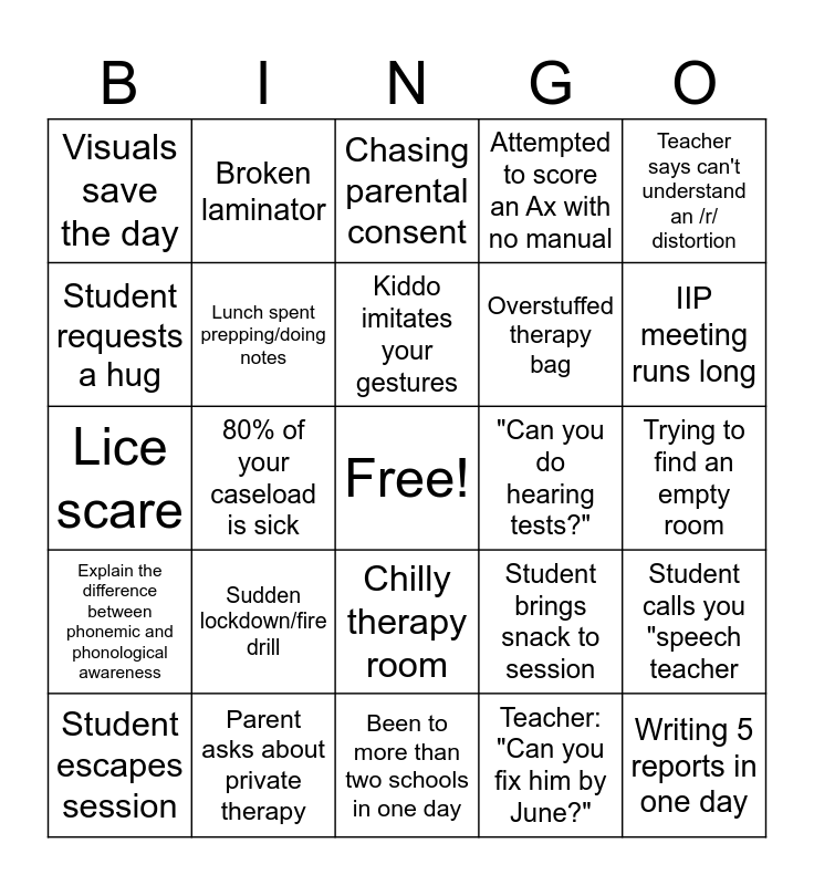 This bingo card has a free space and 24 words: Sudden lockdown/fire drill, Parent asks about private therapy, Kiddo imitates your gestures, Student escapes session, Teacher says can't understand an /r/ distortion, Visuals save the day, Student requests a hug, Broken laminator, "Can you do hearing tests?", Chilly therapy room, Overstuffed therapy bag, Lice scare, Student brings snack to session, Student calls you "speech teacher, Lunch spent prepping/doing notes, Teacher: "Can you fix him by June?", Trying to find an empty room, Chasing parental consent, IIP meeting runs long, 80% of your caseload is sick, Writing 5 reports in one day, Explain the difference between phonemic and phonological awareness, Attempted to score an Ax with no manual and Been to more than two schools in one day.