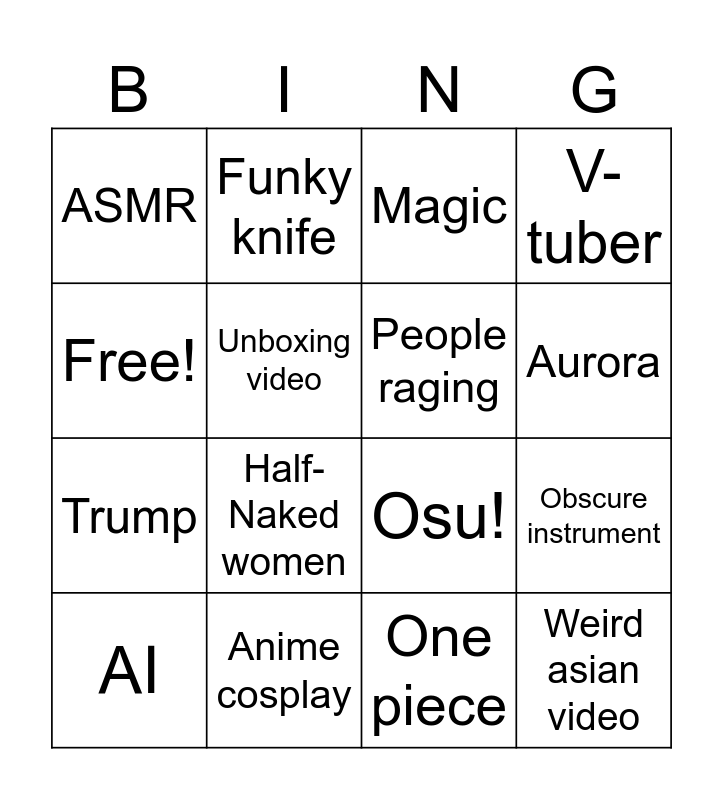 This bingo card has 16 words: Anime cosplay, Obscure instrument, Magic, ASMR, Trump, Funky knife, Osu!, One piece, Free!, Unboxing video, AI, V-tuber, Half-Naked women, Aurora, People raging and Weird asian video.