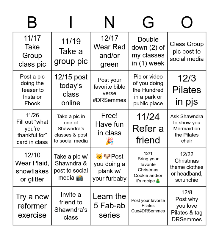 This bingo card has a free space and 24 words: Take a pic w/ Shawndra & post to social media 📸, Invite a friend to Shawndra’s class, Post your favorite bible verse #DRSemmes, Try a new reformer exercise, Class Group pic post to social media, 11/17 Take Group class pic, Post a pic doing the Teaser to Insta or Fbook, 11/19 Take a group pic, 11/24 Refer a friend, 🐱🐶Post you doing a plank w/ your furbaby, Pic or video of you doing the Hundred in a park or public place, 11/26 Fill out “what you’re thankful for” card in class, 12/1 Bring your favorite Christmas Cookie and/or it’s recipe🎄, 12/22 Christmas theme clothes or headband, scrunchie, 12/15 post today’s class online, Post your favorite Pilates Cue#DRSemmes, Ask Shawndra to show you Mermaid on the Pilates chair, 12/17 Wear Red and/or green, 12/3 Pilates in pjs, Take a pic in one of Shawndra’s classes & post to social media, 12/8 Post why you love Pilates & tag DRSemmes, 12/10 Wear Plaid, snowflakes or glitter, Double down (2) of my classes in (1) week and Learn the 5 Fab-ab series.