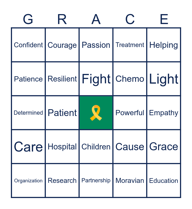 This bingo card has a free space and 64 words: Pediatric, Cancer, Awareness, Grace, Hope, Inspiration, Courage, Strength, Fight, Kids, Children, Kindness, Empathy, Helping, Brave, Patience, Patient, Confident, Tenacity, Chemo, Hospital, Care, Treatment, Oncology, Nurse, Doctor, Philanthropy, Good Vibes, Blue, Green, Gold, Together, Community, Unity, Light, Organization, Champion, Moravian, Support, Resilient, Determined, Powerful, Mighty, Capable, Advocate, Education, Research, Non-Profit, Cause, Radiology, LVHN, St.Lukes, Partnership, System, Team, Love, Passion, Club, Impact, Health, Therapy, Assist, WITHGrace and Warrior.