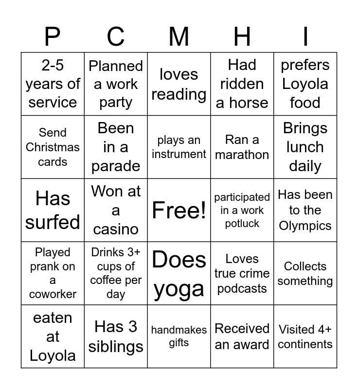This bingo card has a free space and 24 words: Drinks 3+ cups of coffee per day, Has 3 siblings, plays an instrument, eaten at Loyola, prefers Loyola food, 2-5 years of service, Send Christmas cards, Planned a work party, participated in a work potluck, Does yoga, Ran a marathon, Has surfed, Loves true crime podcasts, Collects something, Been in a parade, Received an award, Has been to the Olympics, loves reading, Brings lunch daily, Won at a casino, Visited 4+ continents, Played prank on a coworker, Had ridden a horse and handmakes gifts.
