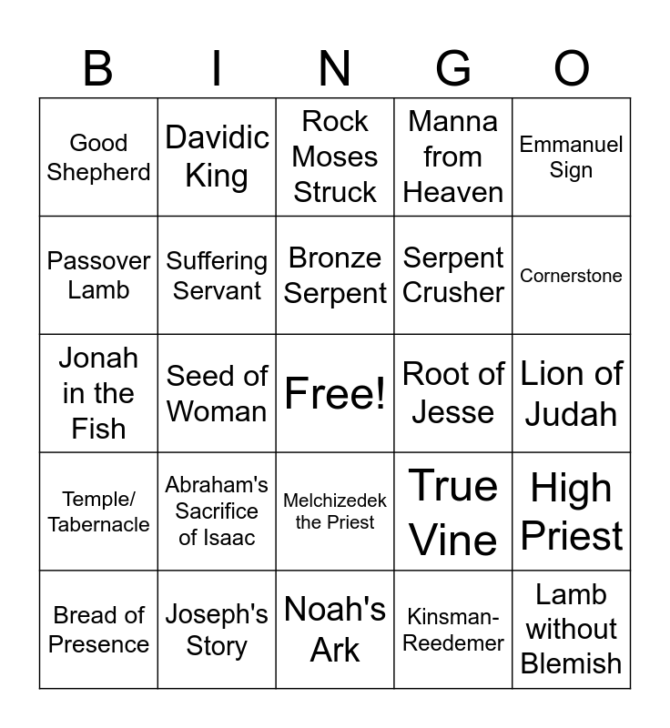 This bingo card has a free space and 24 words: Abraham's Sacrifice of Isaac, Joseph's Story, Bronze Serpent, Bread of Presence, Emmanuel Sign, Good Shepherd, Passover Lamb, Davidic King, Root of Jesse, Melchizedek the Priest, Serpent Crusher, Jonah in the Fish, True Vine, High Priest, Suffering Servant, Kinsman- Reedemer, Lion of Judah, Rock Moses Struck, Cornerstone, Seed of Woman, Lamb without Blemish, Temple/ Tabernacle, Manna from Heaven and Noah's Ark.
