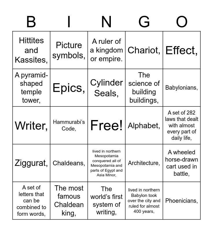 This bingo card has a free space and 36 words: Cuneiform,, Pictographs,, Scribe,, Epics,, Architecture,, Ziggurat,, Cylinder Seals,, Achievement,, Effect,, Monarch,, Hammurabi’s Code,, Chariot,, Nebuchadnezzar,, Alphabet,, Babylonians,, Hittites and Kassites,, Assyrians,, Chaldeans,, Phoenicians,, A ruler of a kingdom or empire., A set of 282 laws that dealt with almost every part of daily life,, A wheeled horse-drawn cart used in battle,, The most famous Chaldean king,, A set of letters that can be combined to form words,, The world’s first system of writing,, Picture symbols,, Writer,, Long poems to tell the story of heroes,, The science of building buildings,, A pyramid-shaped temple tower,, small objects that are engraved with designs,, built a strong kingdom in Asia Minor captured Babylon around 1595 BCE,, lived in northern Babylon took over the city and ruled for almost 400 years,, lived in northern Mesopotamia conquered all of Mesopotamia and parts of Egypt and Asia Minor,, A group from the Syrian Desert led other people in an attack on the Assyrians in 612 BCE, and a wealthy trading society.