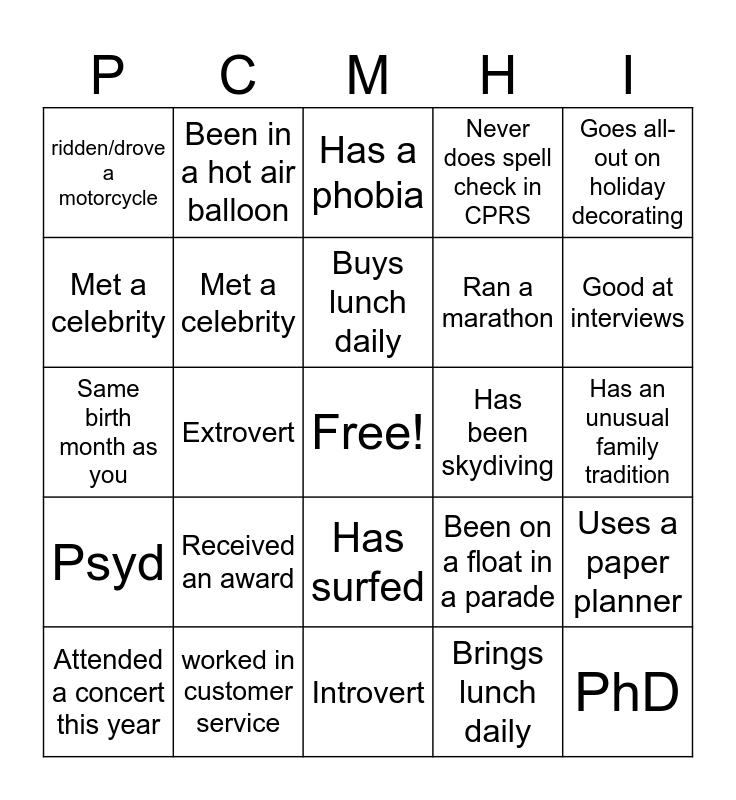 This bingo card has a free space and 24 words: Received an award, worked in customer service, Buys lunch daily, Attended a concert this year, Goes all-out on holiday decorating, ridden/drove a motorcycle, Met a celebrity, Been in a hot air balloon, Has been skydiving, Has surfed, Ran a marathon, Same birth month as you, Been on a float in a parade, Uses a paper planner, Met a celebrity, Brings lunch daily, Has an unusual family tradition, Has a phobia, Good at interviews, Extrovert, PhD, Psyd, Never does spell check in CPRS and Introvert.