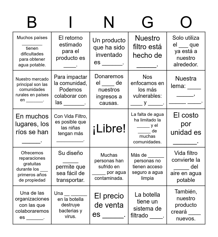 This bingo card has a free space and 24 words: Su diseño _____ permite que sea fácil de transportar., Una __ ______ en la botella destruye bacterias y virus., Donaremos el ____ de nuestros ingresos a causas., Una de las organizaciones con las que colaboraremos es ______., Solo utiliza el ___ que ya está a nuestro alrededor., Muchos países ________ tienen dificultades para obtener agua potable., Nuestro mercado principal son las comunidades rurales en países en _______., El retorno estimado para el producto es ____., La falta de agua ha limitado la _____ y el _____ de muchas comunidades., Muchas personas han sufrido en _____ por agua contaminada., Nos enfocamos en los más vulnerables: ____ y _____., En muchos lugares, los ríos se han _____., Más de ______ personas no tienen acceso seguro a agua limpia, Vida filtro convierte la _____ del aire en agua potable, Para impactar la comunidad, Podemos colaborar con las _______., La botella tiene un sistema de filtrado ____., El costo por unidad es ______., Un producto que ha sido inventado es ______., Nuestra lema: ____ _____, _____ ____., Con Vida Filtro, es posible que las niñas tengan más __________., También, nuestro producto creará ____ nuevos., Ofrecemos reparaciones gratuitas durante los ___ primeros años de propiedad, Nuestro filtro está hecho de _____. and El precio de venta es _____..