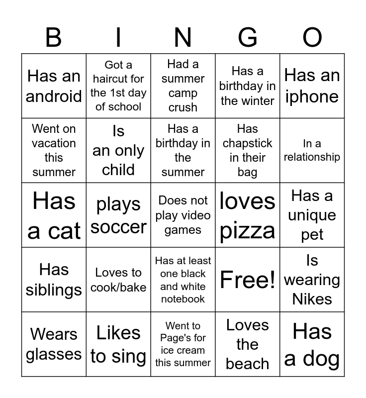 This bingo card has 25 words: Loves to cook/bake, Went to Page's for ice cream this summer, Has a birthday in the summer, Wears glasses, Has an iphone, Has an android, Went on vacation this summer, Got a haircut for the 1st day of school, loves pizza, Has at least one black and white notebook, Has chapstick in their bag, Has a cat, Free!, Is wearing Nikes, Is an only child, Has a dog, Has a unique pet, Had a summer camp crush, In a relationship, plays soccer, Does not play video games, Likes to sing, Has siblings, Has a birthday in the winter and Loves the beach.