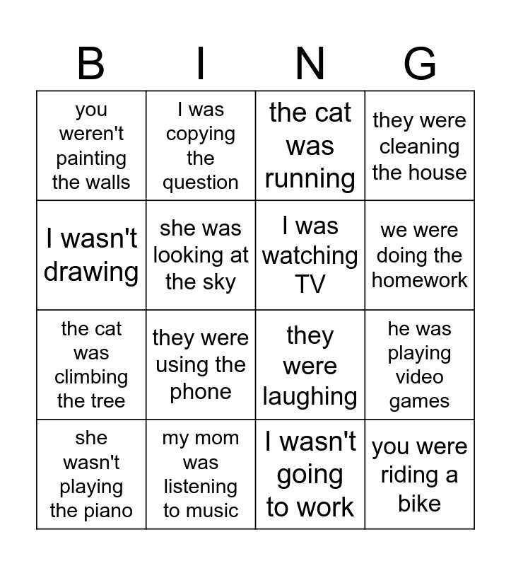This bingo card has 32 words: she was singing, they were walking to school, he was playing video games, she wasn't brushing her hair, you were riding a bike, I was watching TV, I wasn't drawing, I was calling my mom, I was copying the question, we were studying Math, we were doing the homework, the cat was running, you were making a cake, the dog wasn't sleeping, my mom was listening to music, he was talking with his father, he was crying, they were laughing, she wasn't cooking, it wasn't raining, we weren't drinking alcohol, she was eating dinner, I wasn't going to work, he was reading a book, she wasn't playing the piano, they were cleaning the house, the cat was climbing the tree, she was looking at the sky, you weren't painting the walls, he was cutting paper, she was writing a story and they were using the phone.