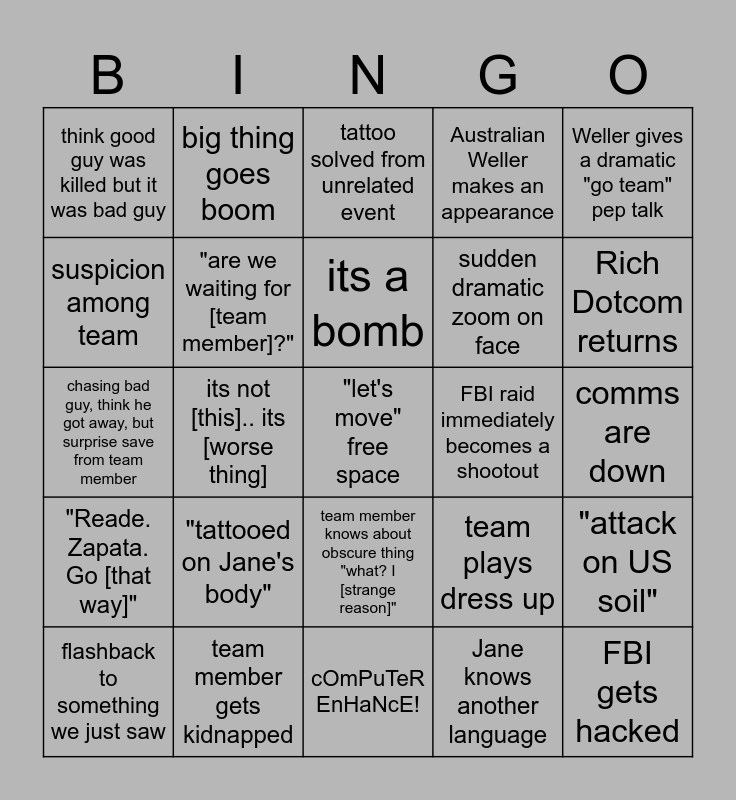 This bingo card has a free space and 29 words: flashback to something we just saw, Wells sums it up with dramatic line, its not [this].. its [worse thing], someone swoops in to save team member, think good guy was killed but it was bad guy, tattoo solved from unrelated event, "are we waiting for [team member]?", "tattooed on Jane's body", FBI raid immediately becomes a shootout, team member gets kidnapped, comms are down, FBI gets hacked, cOmPuTeR EnHaNcE!, Jane knows another language, Rich Dotcom returns, tracker fails/turned off, team member knows about obscure thing "what? I [strange reason]", "Reade. Zapata. Go [that way]", Weller gives a dramatic "go team" pep talk, chasing bad guy, think he got away, but surprise save from team member, team plays dress up, team member goes against direct order, sudden dramatic zoom on face, suspicion among team, Australian Weller makes an appearance, big thing goes boom, "attack on US soil", its a bomb and unrealistic tire screech.