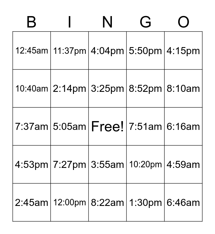 This bingo card has a free space and 39 words: 1:15pm, 1:04pm, 1:25am, 2:14pm, 2:45am, 3:55am, 3:25pm, 3:00pm, 4:15pm, 4:53pm, 5:05am, 5:50pm, 6:46am, 6:16am, 7:51am, 7:27pm, 12:58pm, 12:45am, 10:35am, 10:20pm, 10:40am, 8:22am, 8:52pm, 8:10am, 9:19am, 9:49am, 9:12pm, 11:07am, 11:17am, 11:37pm, 1:05am, 6:06am, 4:04pm, 12:00pm, 1:30pm, 3:15am, 4:59am, 7:37am and 12:00am.