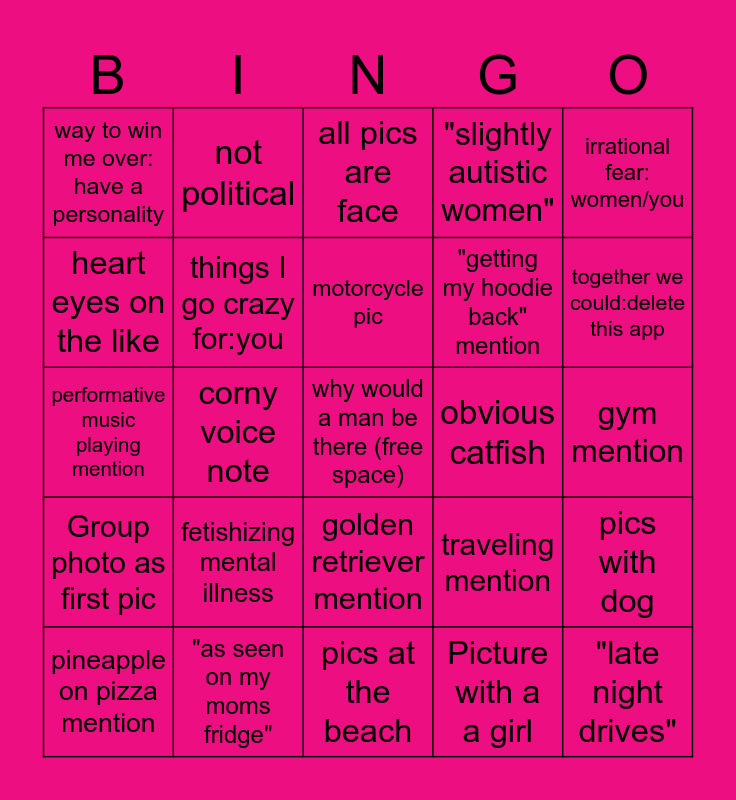 This bingo card has a free space and 34 words: Picture with dead animal, Picture with a a girl, Smoking Weed Pic, In a truck, Group photo as first pic, things I go crazy for:you, irrational fear: women/you, pineapple on pizza mention, not political, love lang: touch, motorcycle pic, all pics are face, performative cat mention, looking for: still figuring it out, obvious catfish, together we could:delete this app, "as seen on my moms fridge", performative music playing mention, fetishizing mental illness, traveling mention, golden retriever mention, blue collar pics, way to win me over: have a personality, gym mention, pics at the beach, "late night drives", "slightly autistic women", pics at the bar/club, "getting my hoodie back" mention, heart eyes on the like, typical Sundays: Sunday scaries/rot, corny voice note, pics with dog and name is mike.