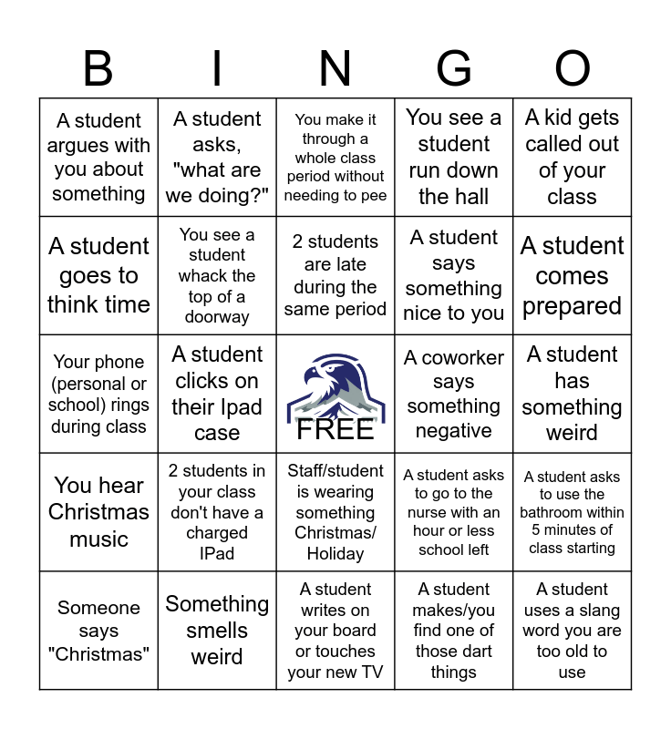 This bingo card has a free space and 49 words: A student makes some reference to "6-7", A student uses a slang word you are too old to use, A student swears, A student writes on your board or touches your new TV, 2 students in your class don't have a charged IPad, A student asks to borrow a pencil, A student asks, "what are we doing?", A student asks, "are we doing anything today?", A student goes to think time, A student comes to your room for think time, You see a student whack the top of a doorway, You see a student run down the hall, A student asks to use the bathroom within 5 minutes of class starting, A student asks to go to the nurse with an hour or less school left, A student asks to go to the nurse, Student asks to go to another class to get something, 2 students are late during the same period, A coworker says something negative, A coworker says something positive, A kid gets called out of your class, A student clicks on their Ipad case, A student makes/you find one of those dart things, A student argues with you about something, A student says something nice to you, A student says something nice to another student, A student comes prepared, Someone says "Christmas", A student is wearing something you would never wear, Staff/student is wearing something Christmas/ Holiday, You hear Christmas music, Kids keep repeating something, Kid asks for an ice pack or a bandaid, You see a staff member smile, You see Saddler run by, Something smells weird, It's too hot in here, It's too cold in here, A kid screams for no reason, A student has something weird, A student says something weird, but you don't ask, At least 5 students get right to work when asked, You only have to remind "that" student once to get on task (instead of 6 times), Someone says, "Thank you.", Side Hug, Your phone (personal or school) rings during class, You make it through a whole class period without needing to pee, You drink at least 20oz of water, You give 2 compliments and You send a positive student email home.