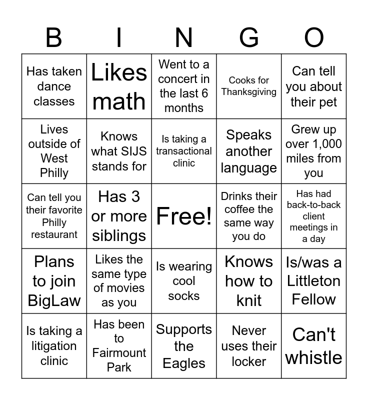 This bingo card has a free space and 24 words: Likes the same type of movies as you, Has been to Fairmount Park, Is taking a transactional clinic, Is taking a litigation clinic, Can tell you about their pet, Has taken dance classes, Lives outside of West Philly, Likes math, Drinks their coffee the same way you do, Is wearing cool socks, Speaks another language, Can tell you their favorite Philly restaurant, Knows how to knit, Is/was a Littleton Fellow, Knows what SIJS stands for, Never uses their locker, Has had back-to-back client meetings in a day, Went to a concert in the last 6 months, Grew up over 1,000 miles from you, Has 3 or more siblings, Can't whistle, Plans to join BigLaw, Cooks for Thanksgiving and Supports the Eagles.