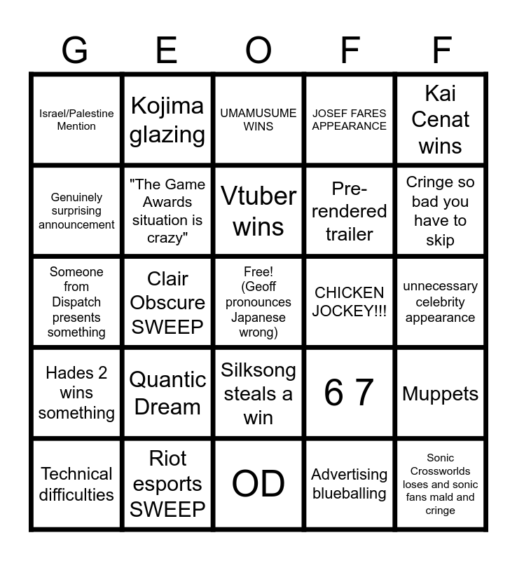 This bingo card has a free space and 29 words: Technical difficulties, Deltarune mention, Clair Obscure SWEEP, NEIL CUCKMANN APPEARANCE, Israel/Palestine Mention, UMAMUSUME WINS, "The Game Awards situation is crazy", Quantic Dream, CHICKEN JOCKEY!!!, Riot esports SWEEP, unnecessary celebrity appearance, Sonic Crossworlds loses and sonic fans mald and cringe, OD, Advertising blueballing, Cringe so bad you have to skip, Livestream Chat is BASED!!!, Silksong steals a win, Hades 2 wins something, Kai Cenat wins, Someone from Dispatch presents something, 6 7, No Mans Sky wins Best Ongoing, Pre-rendered trailer, Genuinely surprising announcement, JOSEF FARES APPEARANCE, Kojima glazing, Muppets, Vtuber wins and TLOU S2 wins.