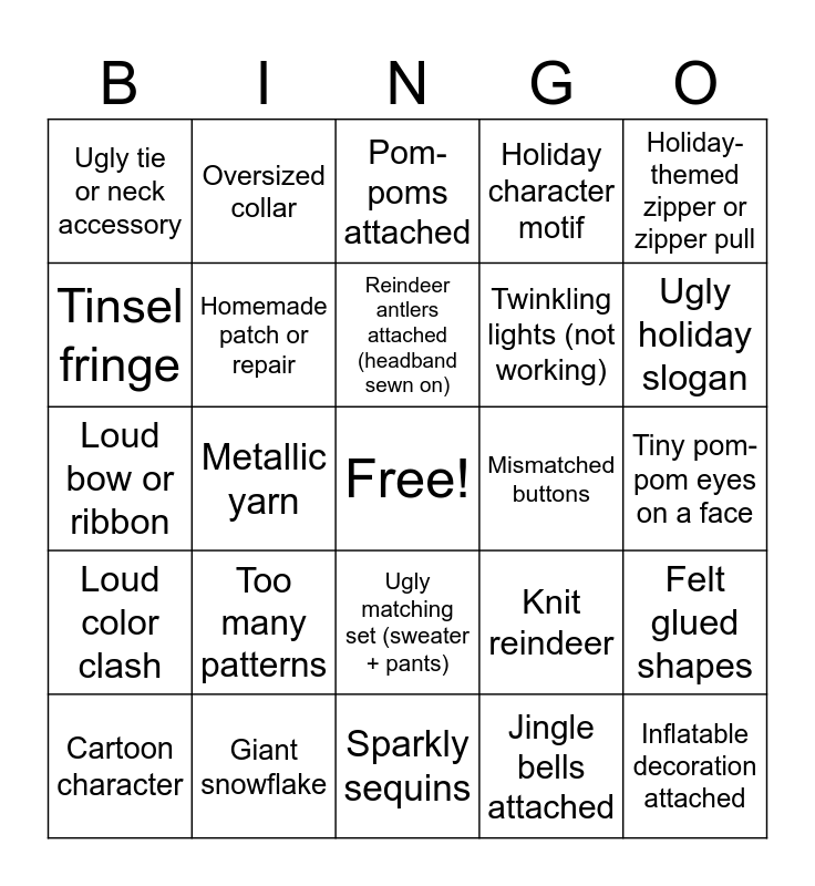 This bingo card has a free space and 27 words: Knit reindeer, Twinkling lights (working), Twinkling lights (not working), Sparkly sequins, Tinsel fringe, Pom-poms attached, Oversized collar, Loud color clash, Mismatched buttons, Felt glued shapes, Loud bow or ribbon, Holiday character motif, Cartoon character, Giant snowflake, Ugly holiday slogan, Family name or initials embroidered, Homemade patch or repair, Reindeer antlers attached (headband sewn on), Too many patterns, Ugly tie or neck accessory, Tiny pom-pom eyes on a face, Jingle bells attached, Metallic yarn, Inflatable decoration attached, Ugly matching set (sweater + pants), Holiday-themed zipper or zipper pull and Oversized patchwork squares.
