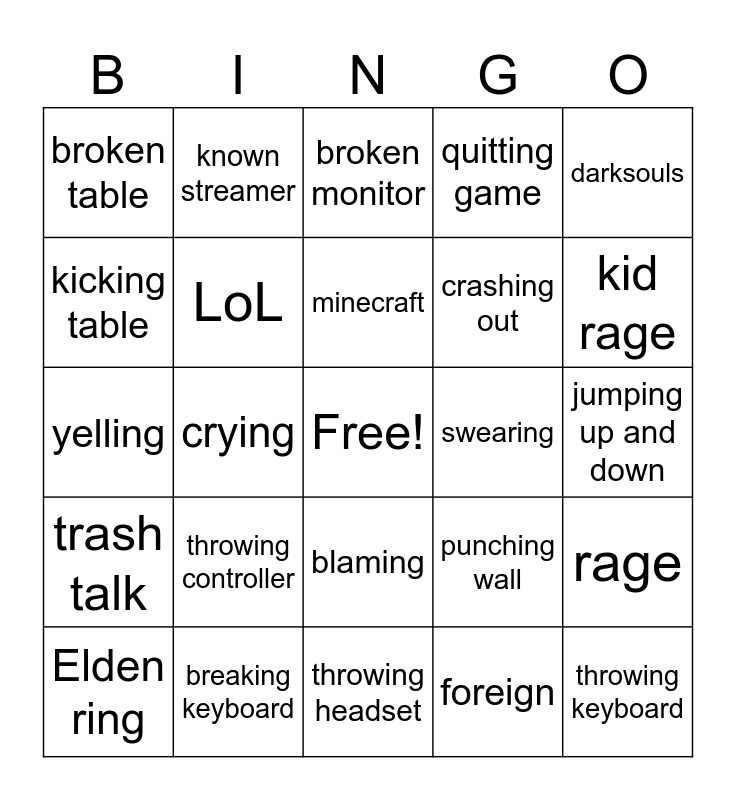 This bingo card has a free space and 24 words: throwing controller, breaking keyboard, minecraft, Elden ring, darksouls, broken table, kicking table, known streamer, swearing, blaming, crashing out, yelling, punching wall, rage, LoL, foreign, jumping up and down, broken monitor, kid rage, crying, throwing keyboard, trash talk, quitting game and throwing headset.