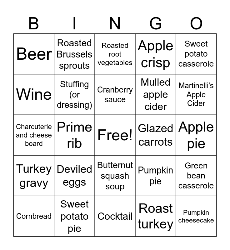 This bingo card has a free space and 32 words: Roast turkey, Honey‑glazed ham, Prime rib, Mashed potatoes, Turkey gravy, Stuffing (or dressing), Sweet potato casserole, Green bean casserole, Roasted Brussels sprouts, Mac and cheese, Cranberry sauce, Roasted root vegetables, Butternut squash, Corn casserole (corn pudding), Glazed carrots, Parker House rolls (dinner rolls), Cornbread, Charcuterie and cheese board, Butternut squash soup, Deviled eggs, Pumpkin pie, Pecan pie, Apple pie, Sweet potato pie, Pumpkin cheesecake, Apple crisp, Mulled apple cider, Wine, Beer, Cocktail, Sparkling water with cranberry and lime and Martinelli's Apple Cider.