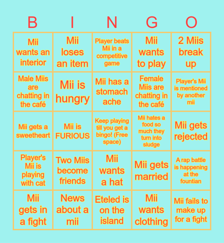 This bingo card has a free space and 34 words: Mii is in love, Mii wants clothing, Mii's baby is crying, Player beats tomodachi quest, Player's Mii is playing with cat, Mii is hungry, 2 Miis break up, Mii gets in a fight, Mii loses an item, Mii has a cold, Mii has a stomach ache, Player beats Mii in a competitive game, Mii gets put in a maid dress, Mii finds their all time favorite food, Mii hates a food so much they turn into sludge, Player's Mii is mentioned by another mii, News about a mii, Mii gets a sweetheart, Two Miis become friends, Mii gets married, Mii wants a hat, Mii has a baby, Mii wants an interior, Mii gets rejected, Eteled is on the island, Mii fails to make up for a fight, Mii wants to play, One of the Miis is a character from a roblox game, Female Miis are chatting in the café, Male Miis are chatting in the café, Mii is dreaming, Mii is FURIOUS, A rap battle is happening at the fountian and Player's Mii levels up.