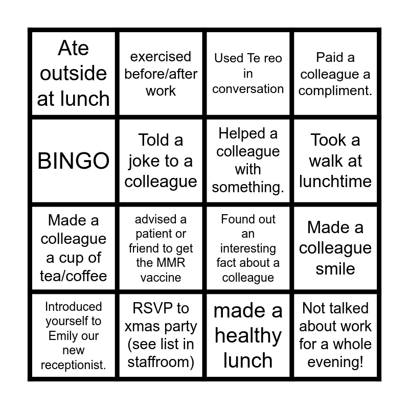 This bingo card has 16 words: RSVP to xmas party (see list in staffroom), Made a colleague smile, Used Te reo in conversation, Ate outside at lunch, Made a colleague a cup of tea/coffee, exercised before/after work, Found out an interesting fact about a colleague, made a healthy lunch, BINGO, Told a joke to a colleague, Introduced yourself to Emily our new receptionist., Paid a colleague a compliment., advised a patient or friend to get the MMR vaccine, Took a walk at lunchtime, Helped a colleague with something. and Not talked about work for a whole evening!.
