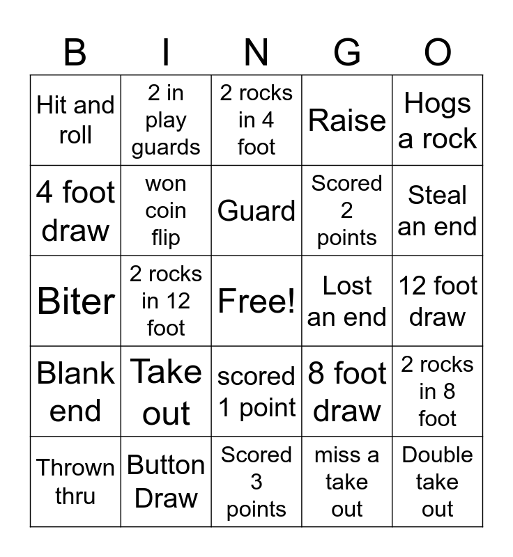 This bingo card has a free space and 24 words: Take out, Button Draw, Guard, Thrown thru, Hogs a rock, Hit and roll, 4 foot draw, 2 in play guards, Lost an end, scored 1 point, Scored 2 points, Biter, 8 foot draw, 2 rocks in 8 foot, won coin flip, miss a take out, 12 foot draw, 2 rocks in 4 foot, Steal an end, 2 rocks in 12 foot, Double take out, Blank end, Raise and Scored 3 points.