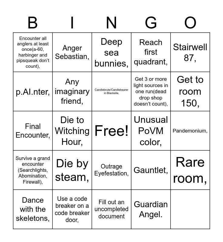 This bingo card has a free space and 24 words: Survive a grand encounter (Searchlights, Abomination, Firewall),, Use a code breaker on a code breaker door,, Outrage Eyefestation,, Gauntlet,, Stairwell 87,, Encounter all anglers at least once(a-60, harbinger and pipsqueak don’t count),, Anger Sebastian,, Deep sea bunnies,, Get 3 or more light sources in one run(dead drop shop doesn’t count),, Rare room,, p.AI.nter,, Any imaginary friend,, Buy all of Sebastian’s shop(not the document),, Unusual PoVM color,, Get to room 150,, Dance with the skeletons,, Die to Witching Hour,, Candlebrute/Candlebearer in Blacksite,, Reach first quadrant,, Pandemonium,, Final Encounter,, Die by steam,, Fill out an uncompleted document and Guardian Angel..