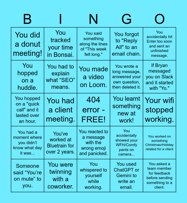 This bingo card has a free space and 34 words: You sent a GIF in Slack instead of words., You used ChatGPT or Gemini to write an email., You saw someone’s pet on a call., You wore or used Bluetrain swag., You had a moment where you didn’t know what day it was..., You had to explain what “SEO” means., You accidentally hit Enter too soon and sent an unfinished message., Someone said “You’re on mute” to you., You tracked your time in Bonsai., Meta made you want to scream or cry., You made a video on Loom., You said something along the lines of "This week felt long.", You got an "Approved. No revisions."!!!, You made a coworker laugh (or virtually LOL)., You learnt something new at work!, If Bryan messaged you on Slack and it started with "Yo.", You were twinning with a coworker., You hopped on a "quick call" and it lasted over an hour., You've worked at Bluetrain for over 2 years., You accidentally showed your WFH/Comfy pants on camera..., You reacted to a message with the wrong emoji and panicked., You have more than 5 tabs open., You did a donut meeting!, Your wifi stopped working., You whispered to yourself while working., You asked a team member for feedback before sending something to a client., You forgot to "Reply All" to an email chain., You had more than one coffee/tea in a day., You wrote a long message, answered your own question, then deleted it., You hopped on a huddle., You worked on a quarterly rock!, You had a client meeting., You worked on something Christmas/Holiday related for a client and You had a sneaky mid-work treat.