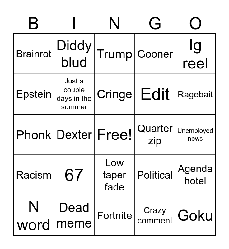 This bingo card has a free space and 24 words: 67, Dead meme, Cringe, N word, Ig reel, Brainrot, Epstein, Diddy blud, Quarter zip, Low taper fade, Edit, Phonk, Political, Agenda hotel, Just a couple days in the summer, Crazy comment, Unemployed news, Trump, Ragebait, Dexter, Goku, Racism, Gooner and Fortnite.