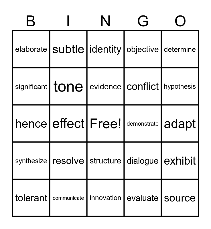 This bingo card has a free space and 100 words: abrupt, acknowledge, adapt, although, ambition, analyze, apparent, argument, bias, cause, cautious, claim, collaborate, communicate, comprehend, concept, conflict, consequence, consequently, contradict, conversely, credible, criteria, culture, deduce, demonstrate, determine, dialogue, distinguish, diverse, effect, elaborate, essential, establish, evaluate, evidence, exhibit, fictional, fierce, format, furthermore, grim, hence, humble, hypothesis, identity, illustrate, immense, inference, innovation, integrity, isolate, justify, manipulate, meanwhile, meticulous, mood, moreover, motive, objective, observe, obvious, optimism, parallel, perspective, persuade, practical, precise, predict, principle, reflect, resolve, resource, rigid, routine, sequence, setting, significant, simultaneously, sincere, skeptical, source, spontaneous, structure, subsequently, subtle, summarize, sustain, symbol, synthesize, tentative, theme, therefore, tolerant, tone, turbulent, unique, verify, vivid and vulnerable.