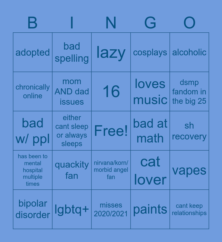 This bingo card has a free space and 24 words: quackity fan, lgbtq+, 16, bipolar disorder, alcoholic, adopted, chronically online, bad spelling, bad at math, nirvana/korn/ morbid angel fan, loves music, bad w/ ppl, cat lover, vapes, mom AND dad issues, paints, sh recovery, lazy, dsmp fandom in the big 25, either cant sleep or always sleeps, cant keep relationships, has been to mental hospital multiple times, cosplays and misses 2020/2021.