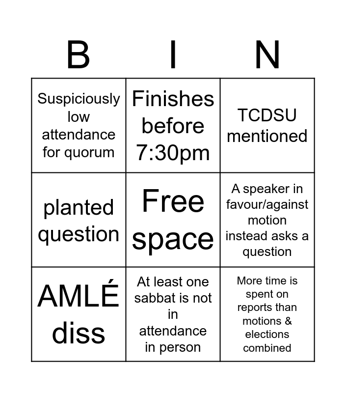 This bingo card has a free space and 8 words: A speaker in favour/against motion instead asks a question, TCDSU mentioned, Finishes before 7:30pm, AMLÉ diss, Suspiciously low attendance for quorum, More time is spent on reports than motions & elections combined, planted question and At least one sabbat is not in attendance in person.