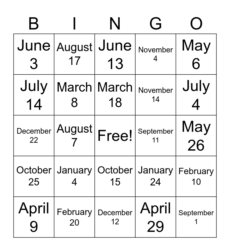 This bingo card has a free space and 24 words: January 4, February 20, March 18, April 9, May 6, June 3, July 14, August 17, September 11, October 15, November 14, December 22, January 24, February 10, March 8, April 29, May 26, June 13, July 4, August 7, September 1, October 25, November 4 and December 12.