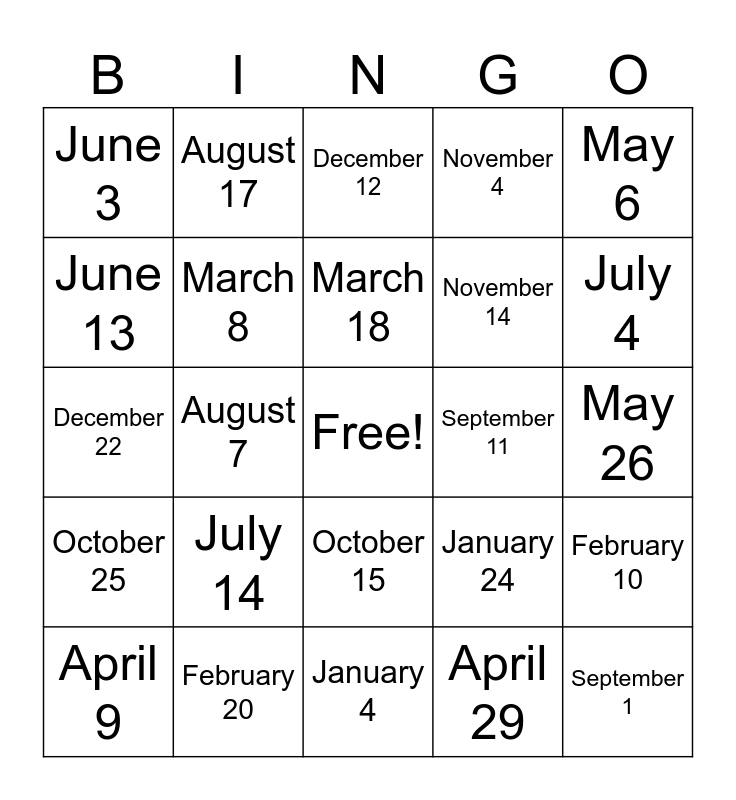 This bingo card has a free space and 24 words: July 14, February 20, March 18, April 9, May 6, June 3, June 13, August 17, September 11, October 15, November 14, December 22, January 24, February 10, March 8, April 29, May 26, December 12, July 4, August 7, September 1, October 25, November 4 and January 4.