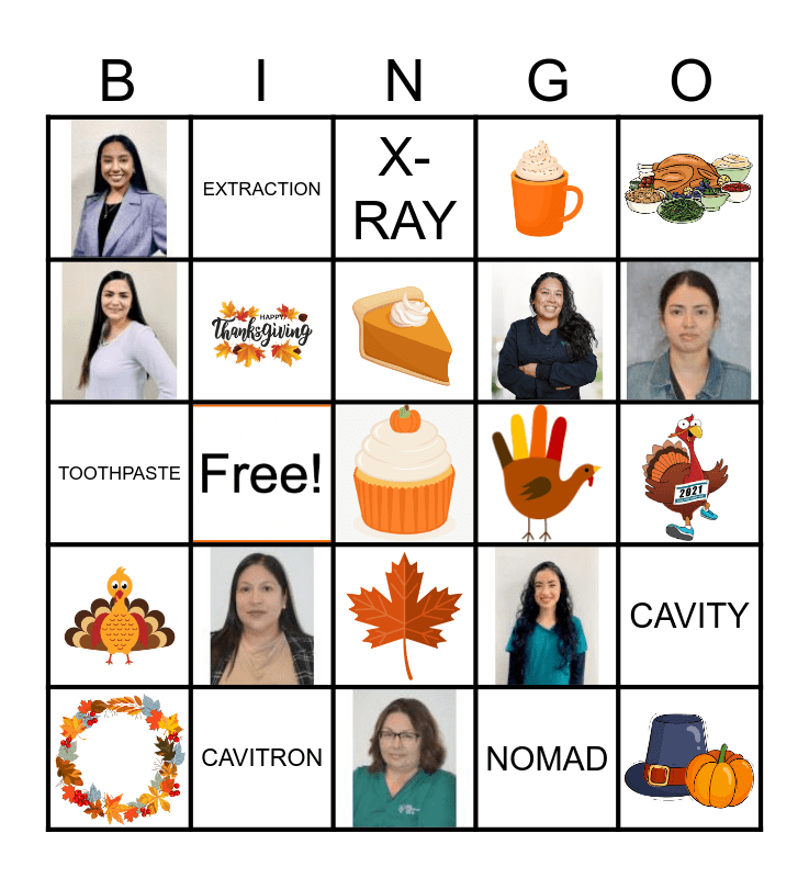 This bingo card has 27 images, a free space and 12 words: SRP, FILLING, EXTRACTION, RCT, PROPHY, X-RAY, CAVITRON, NOMAD, SCALER, CAVITY, TOOTHPASTE and TOOTHBRUSH.