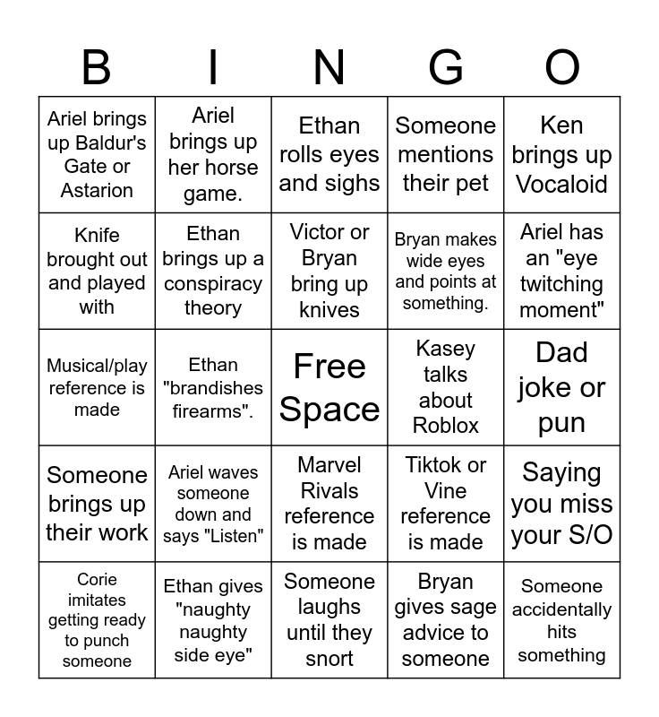 This bingo card has a free space and 24 words: Ariel waves someone down and says "Listen", Ethan gives "naughty naughty side eye", Victor or Bryan bring up knives, Corie imitates getting ready to punch someone, Ken brings up Vocaloid, Ariel brings up Baldur's Gate or Astarion, Knife brought out and played with, Ariel brings up her horse game., Kasey talks about Roblox, Marvel Rivals reference is made, Bryan makes wide eyes and points at something., Musical/play reference is made, Tiktok or Vine reference is made, Saying you miss your S/O, Ethan brings up a conspiracy theory, Bryan gives sage advice to someone, Dad joke or pun, Ethan rolls eyes and sighs, Ariel has an "eye twitching moment", Ethan "brandishes firearms"., Someone accidentally hits something, Someone brings up their work, Someone mentions their pet and Someone laughs until they snort.