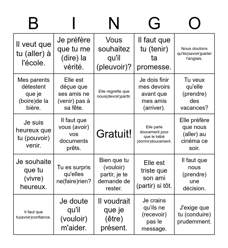 This bingo card has a free space and 25 words: Tu es surpris qu'elles ne(faire)rien?, Il voudrait que je (être) présent., Elle regrette que nous(devoir)partir., Il faut que tu(avoir)confiance., Nous doutons qu'ils(savoir)parler l'anglais., Il veut que tu (aller) à l'école., Mes parents détestent que je (boire)de la bière., Je préfère que tu me (dire) la vérité., Elle parle doucement pour que le bébé (dormir)doucement., Bien que tu (vouloir) partir, je te demande de rester., Je dois finir mes devoirs avant que mes amis (arriver)., Je suis heureux que tu (pouvoir) venir., Elle est triste que son ami (partir) si tôt., Il faut que nous (prendre) une décision., Elle est déçue que ses amis ne (venir) pas à sa fête., Il est nécessaire que tu (écrire) plus souvent., Elle préfère que nous (aller) au cinéma ce soir., Vous souhaitez qu'il (pleuvoir)?, Tu veux qu'elle (prendre) des vacances?, Il faut que vous (avoir) vos documents prêts., J'exige que tu (conduire) prudemment., Je doute qu'il (vouloir) m'aider., Je souhaite que tu (vivre) heureux., Il faut que tu (tenir) ta promesse. and Je crains qu’ils ne (recevoir) pas le message..