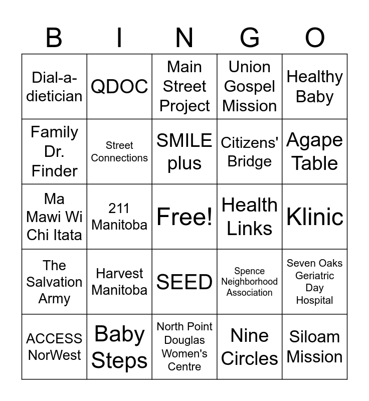 This bingo card has a free space and 24 words: Harvest Manitoba, Baby Steps, SMILE plus, ACCESS NorWest, Healthy Baby, Dial-a-dietician, Family Dr. Finder, QDOC, Health Links, SEED, Citizens' Bridge, Ma Mawi Wi Chi Itata, Spence Neighborhood Association, Seven Oaks Geriatric Day Hospital, Street Connections, Nine Circles, Klinic, Main Street Project, Agape Table, 211 Manitoba, Siloam Mission, The Salvation Army, Union Gospel Mission and North Point Douglas Women's Centre.