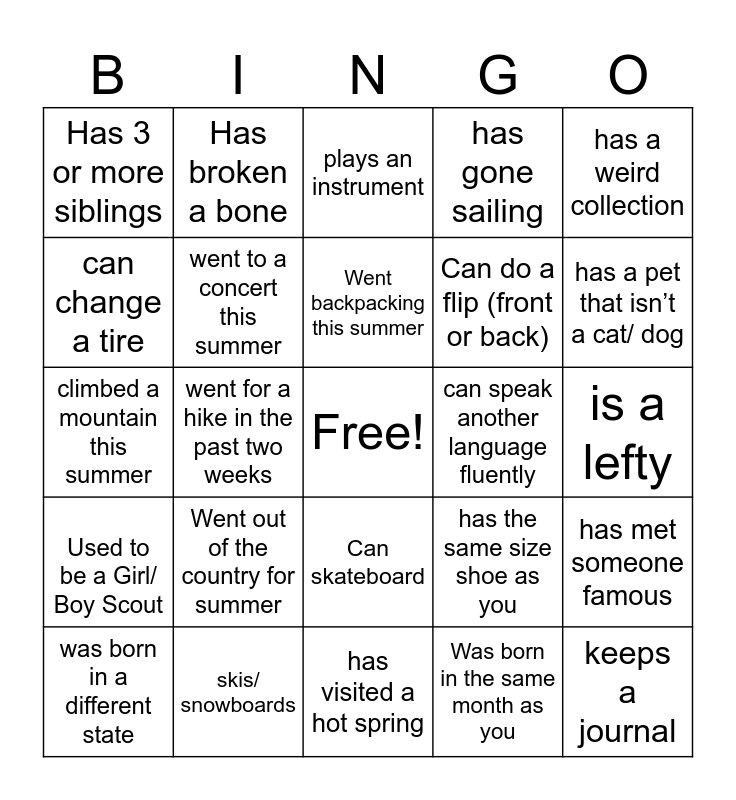 This bingo card has a free space and 24 words: was born in a different state, Went out of the country for summer, Went backpacking this summer, Was born in the same month as you, has a weird collection, Has 3 or more siblings, Has broken a bone, plays an instrument, can speak another language fluently, is a lefty, climbed a mountain this summer, went to a concert this summer, has the same size shoe as you, has met someone famous, can change a tire, skis/ snowboards, has visited a hot spring, has gone sailing, has a pet that isn’t a cat/ dog, Used to be a Girl/ Boy Scout, went for a hike in the past two weeks, Can skateboard, Can do a flip (front or back) and keeps a journal.