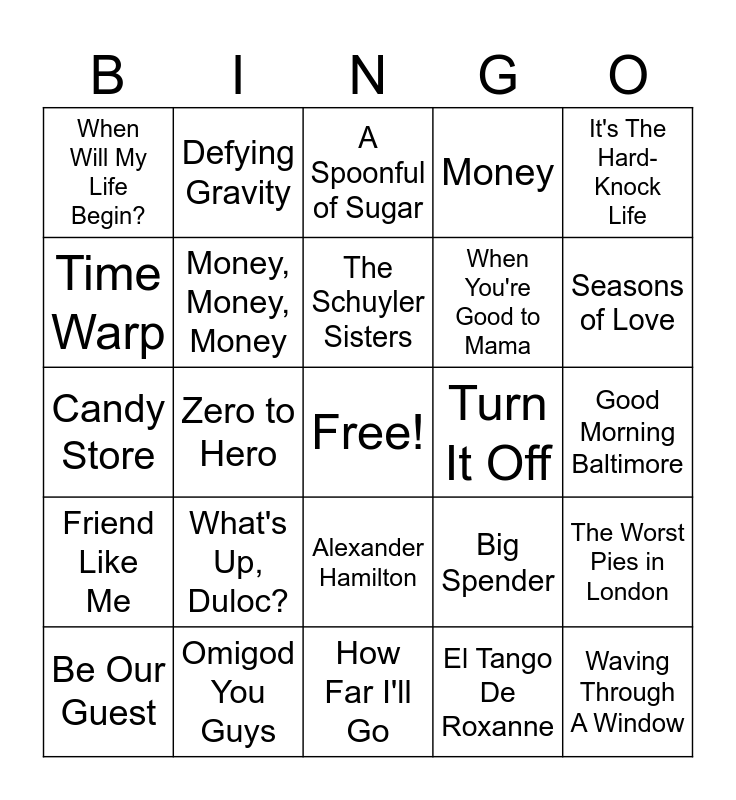 This bingo card has a free space and 40 words: Haus of Holbein, Candy Store, Cell Block Tango, Money, Money, Money, Omigod You Guys, Alexander Hamilton, The Schuyler Sisters, What Is This Feeling?, It's The Hard-Knock Life, Friend Like Me, Zero to Hero, Money, Waving Through A Window, Good Morning Baltimore, Turn It Off, What's Up, Duloc?, I Just Can't Wait to be King, When Will My Life Begin?, Let It Go, A Spoonful of Sugar, The Worst Pies in London, El Tango De Roxanne, When You're Good to Mama, Time Warp, Greased Lightnin', Don't Rain on my Parade, My Favorite Things, Schadenfreude, Mother Knows Best, Stick to the Status Quo, Fabulous, Be Our Guest, Holding Out For A Hero!, Big Spender, Seasons of Love, How Far I'll Go, The Greatest Show, We Don't Talk About Bruno, Defying Gravity and Gimme Gimme.
