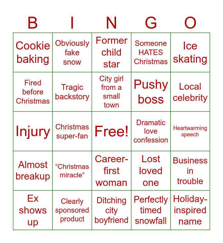 This bingo card has a free space and 61 words: Family tradition, Clearly sponsored product, Secret royalty, Almost breakup, Perfectly timed snowfall, Mistletoe moment, Tragic backstory, Christmas-centric business, Pushy boss, Miscommunication, Someone HATES Christmas, Quick before they leave!, Fired before Christmas, Crafting scene, Random talent, Cookie baking, Holiday-inspired name, Ice skating, Hot cocoa 4eva, City girl from a small town, Dramatic love confession, Former child star, Ex shows up, Business in trouble, Almost kiss, Eggnog mention, Snowed in, Cliché job (ex. baker, innkeeper), Local celebrity, Urgent deadline, Caroling scene, Sentimental ornament, Christmas wish, Reluctant visitor, Obviously fake snow, Festive sweater, Sworn off love, Christmas super-fan, Guy with a truck, Injury, Snowstorm delay, “Christmas miracle”, Heartwarming speech, Main character wears red, Lost loved one, Obligatory montage, Santa in disguise, Old flame encounter, Childhood friends, Career-first woman, Ditching city boyfriend, Huge cozy house, An absurd amount of Christmas lights, Snowball fight, Main Characters literally collide, Tree decorating, Gingerbread contest, Caroling scene, Town festival, Tree farm visit and Festive town event.