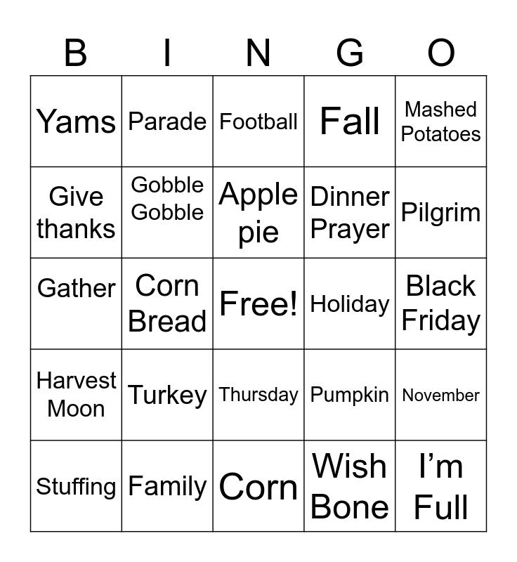 This bingo card has a free space and 24 words: Turkey, Family, Apple pie, Stuffing, Mashed Potatoes, Yams, Give thanks, Parade, Holiday, Thursday, Dinner Prayer, Gather, Pumpkin, November, Gobble Gobble, Wish Bone, Black Friday, Football, Pilgrim, Corn Bread, I’m Full, Harvest Moon, Fall and Corn.