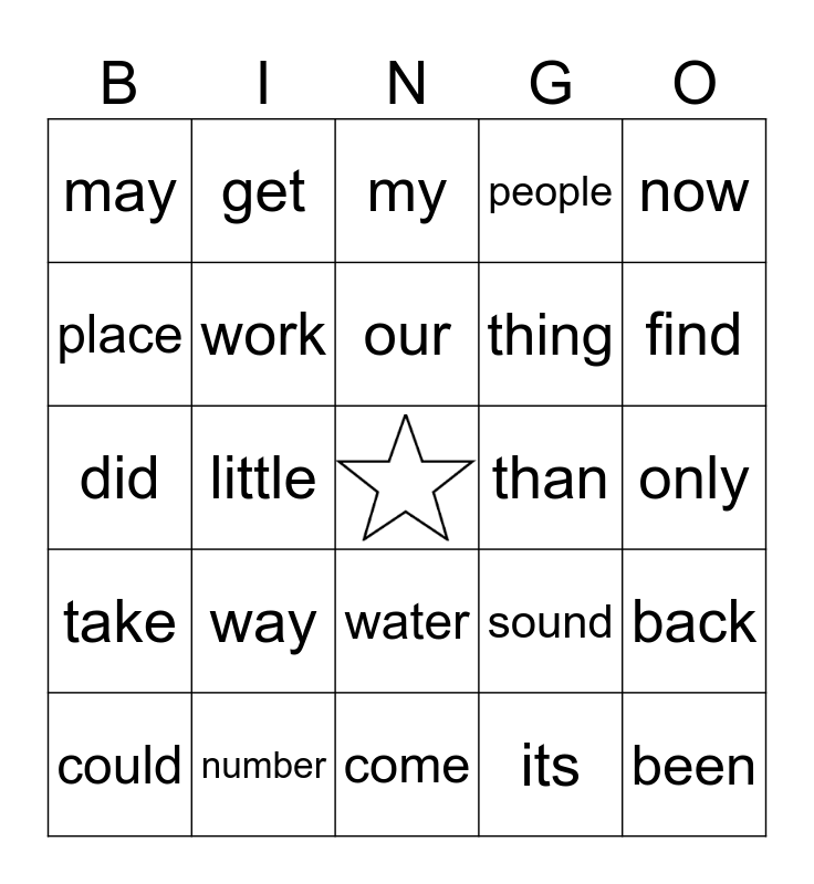 This bingo card has a free space and 45 words: am, been, call, could, first, its, my, no, now, number, people, than, water, way, who, come, day, did, down, find, get, long, made, may, new, only, over, part, sound, take, after, back, give, just, know, little, live, me, most, our, place, thing, very, work and years.
