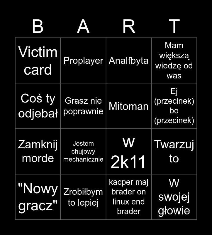 This bingo card has 16 words: Zrobiłbym to lepiej, Twarzuj to, Analfbyta, Victim card, Zamknij morde, Proplayer, w 2k11, kacper maj brader on linux end brader, Coś ty odjebał, Grasz nie poprawnie, "Nowy gracz", Mam większą wiedzę od was, Jestem chujowy mechanicznie, Ej (przecinek) bo (przecinek), Mitoman and W swojej głowie.